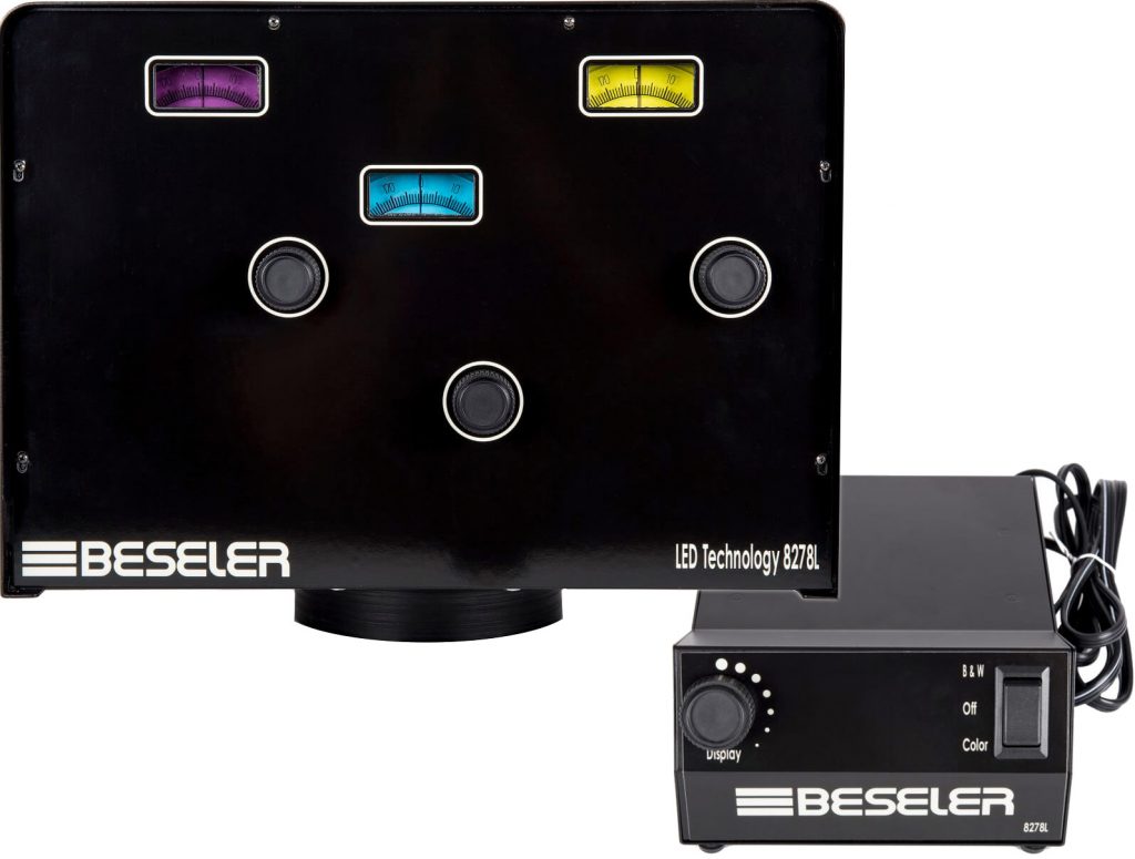 Beseler has stayed true to its traditional design yet adds modern day technology to introduce our new and improved Dichro 45SL Colorhead. This head fits directly onto our 45MXT & 45VXL series enlargers & uses new LED technology to provide a diffusion light source that is reliable and dependable lasting throughout years of darkroom use. The LED lighting has eliminated the need for an internal cooling fan, keeping the unit steady during exposure times. An external stabilized power supply allows change from color to black & white printing with the flick of a switch. Filtration values are individually displayed on an illuminated analog scale with controllable dimmer switch located on the power supply. Filtration values range from 0-200cc of Yellow, Magenta and Cyan.